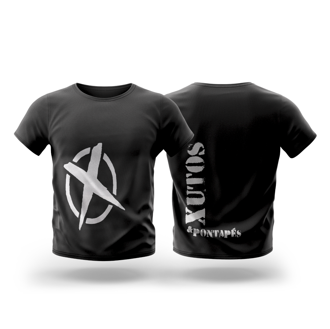 T-Shirt preta com letra cinza à frente e letras brancas nas costas.