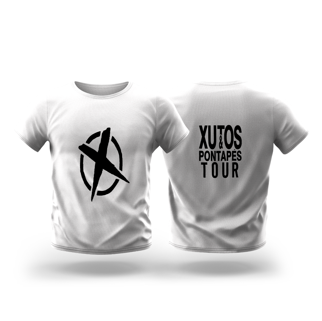 T-Shirt Tour branca com estampado em preto.